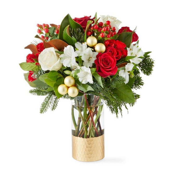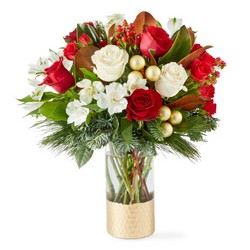 Spread joy this holiday season with a shimmering arrangement of roses, alstroemeria, and the incredible scent of seasonal greens.