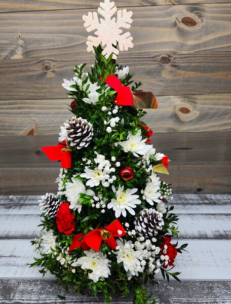 Elegant boxwood stems are hand arranged to look like a mini Christmas tree, complete with all the festive trimmings.